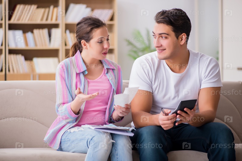 Молодая семья обсуждает семейные финансы