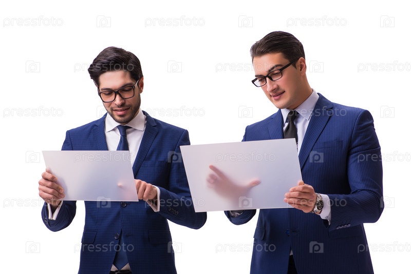 Два бизнесмена с виртуальными планшетами изолированы на белом