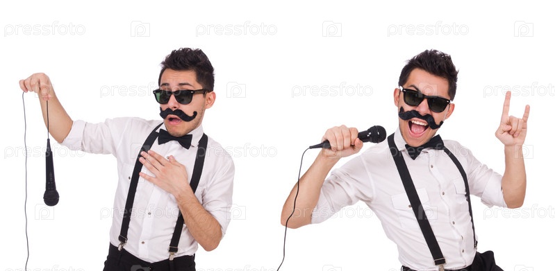 Забавный человек с микрофоном, изолированным на белом