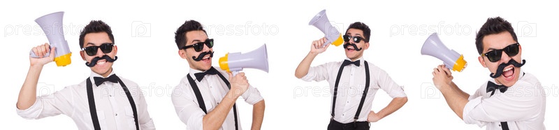 Эмоциональный мужчина с громкоговорителем, изолированным на белом