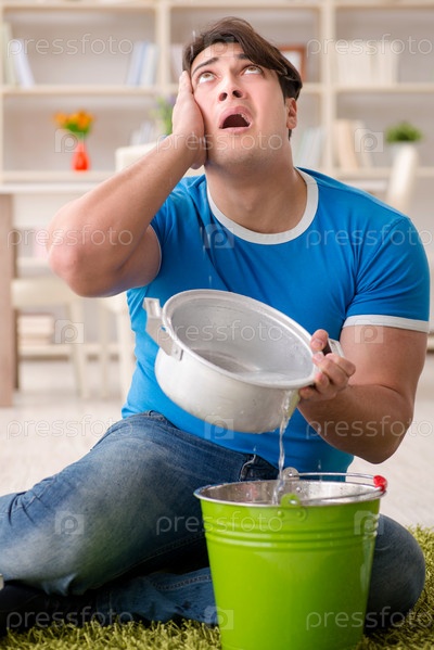 Мужчина дома, имеющий дело с соседней утечкой воды