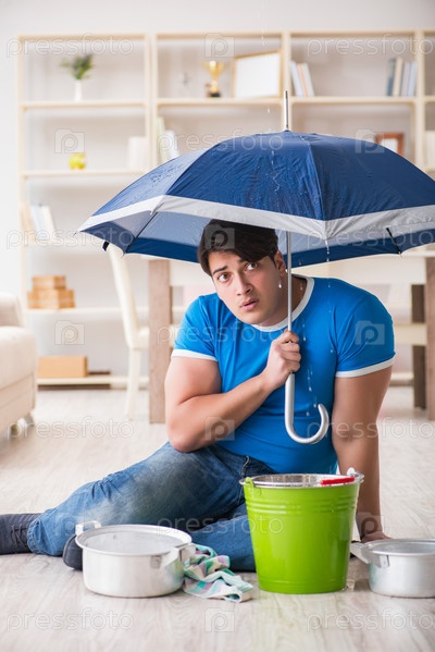Мужчина дома, имеющий дело с соседней утечкой воды