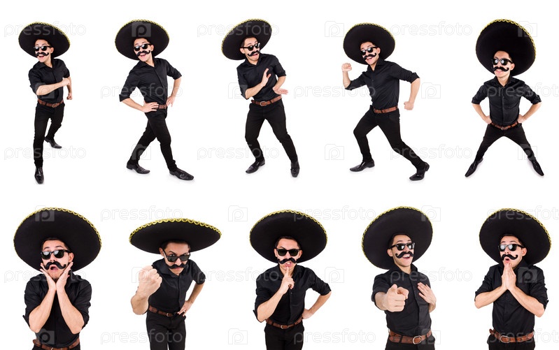 Забавный мужчина в мексиканской шляпе сомбреро, изолированной на белом