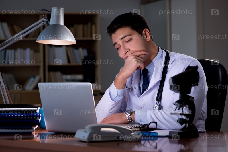 Молодой врач, работающий допоздна в офисе