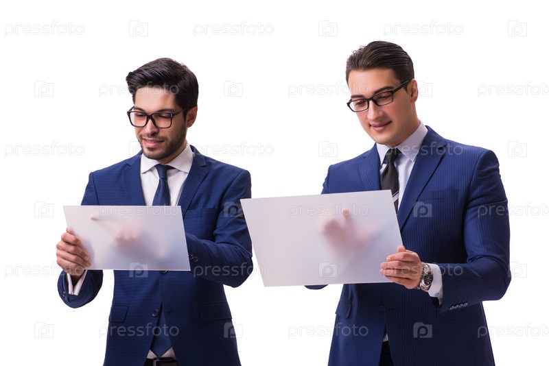 Два бизнесмена с виртуальными планшетами изолированы на белом