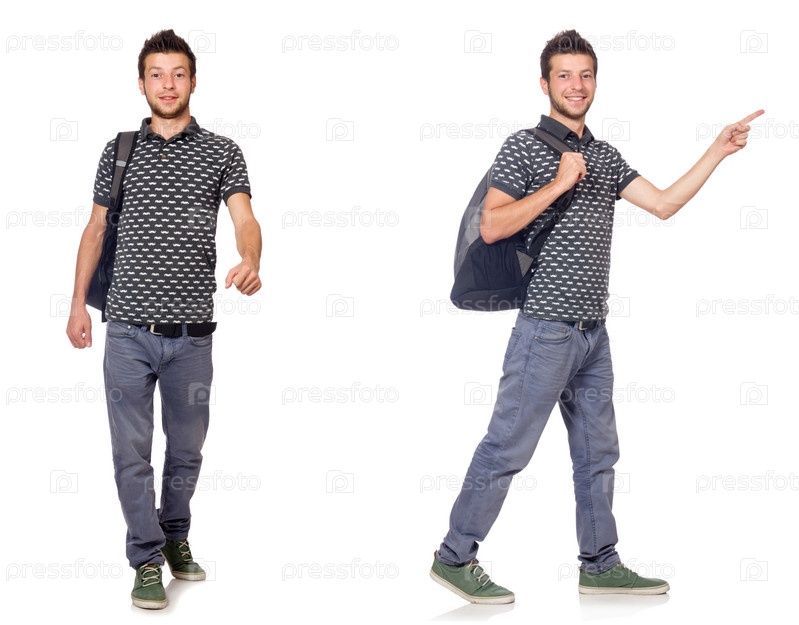 Коллаж студента с рюкзаком на белом