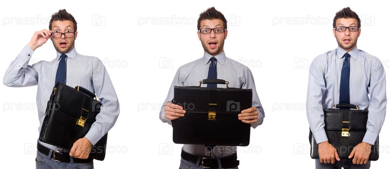Коллаж бизнесмена, изолированного на белом