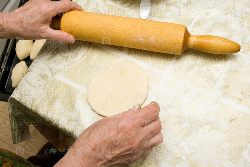 Руки старухи раскатывают тесто скалкой