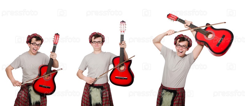 Забавный шотландец с музыкальным инструментом, изолированным на белом