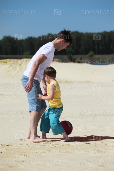 Отец и сын играют в футбол на песке