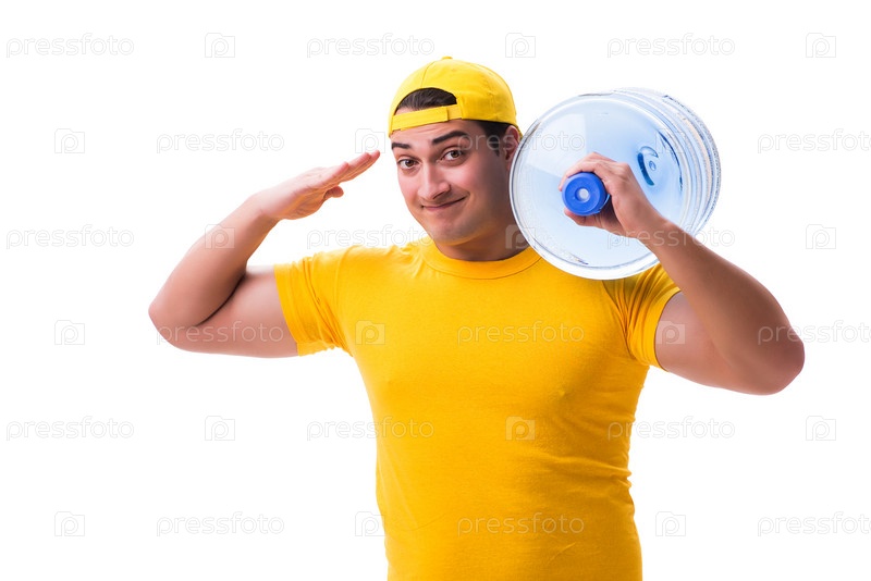 Мужчина доставляет бутылку с водой, изолированную на белом