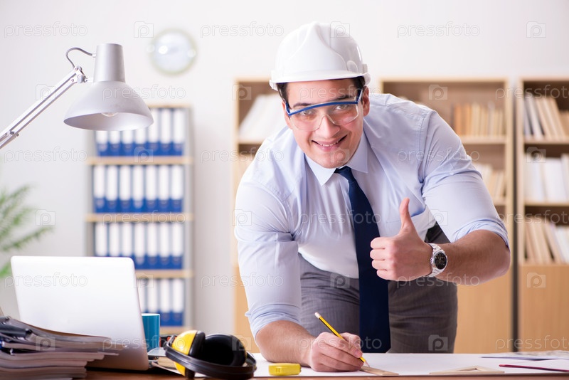 Инженер-начальник работает над чертежами в офисе