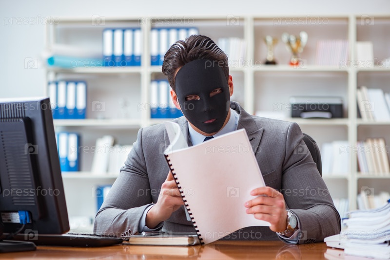 Бизнесмен с маской в офисе концепция лицемерия