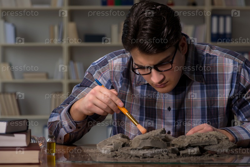 Археолог, работающий поздно ночью в офисе