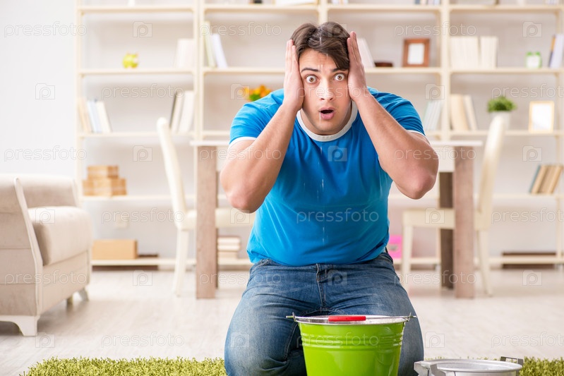 Мужчина дома, имеющий дело с соседней утечкой воды