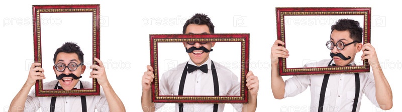 Молодой человек с рамой, изолированной на белом