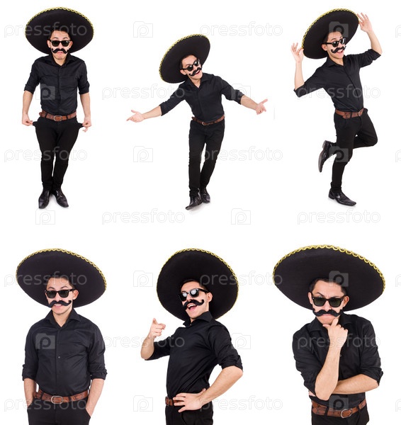 Забавный мужчина в мексиканской шляпе сомбреро, изолированной на белом