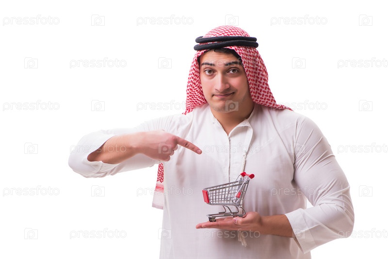 Араб с корзиной для покупок, изолированной на белом