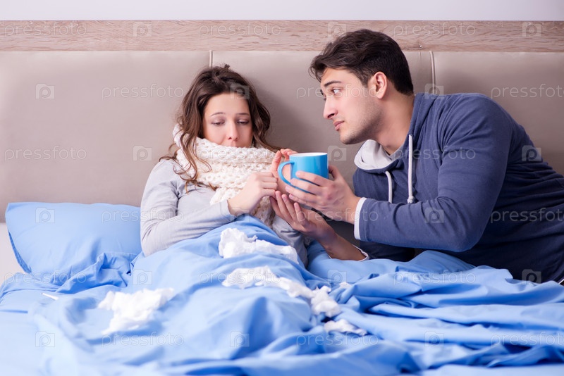 Жена ухаживает за больным мужем дома в постели