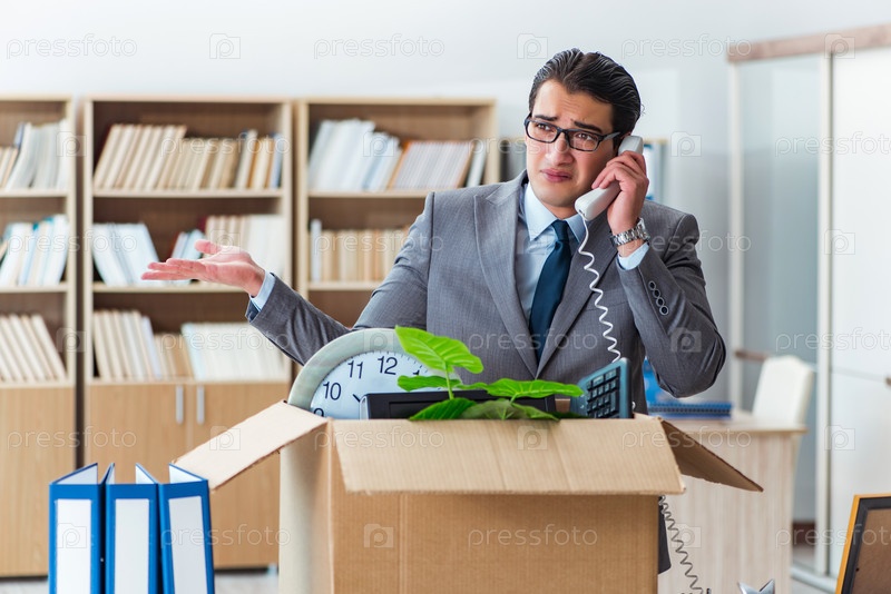 Человек, переезжающий офис с коробкой и его вещами