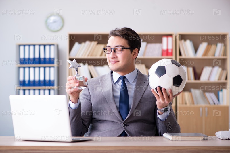 Бизнесмен с футбольным мячом в офисе
