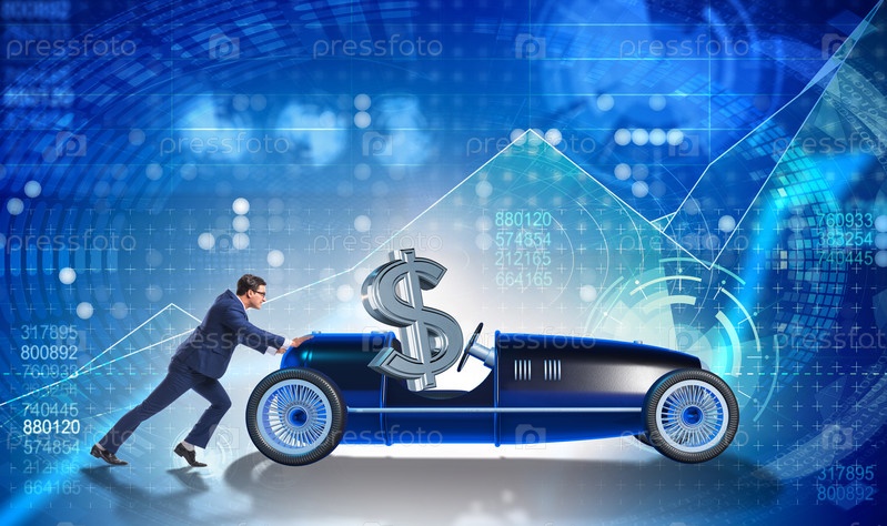 Бизнесмен толкает машину с долларом на сиденье водителя