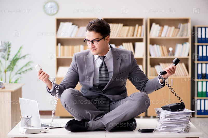 Молодой бизнесмен медитирует в офисе