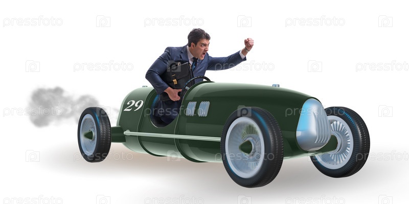 Бизнесмен в винтажном роудстере, изолированный на белом