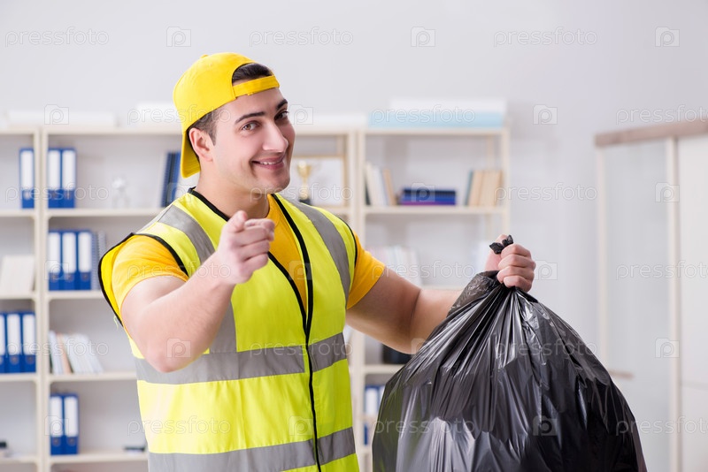 Мужчина убирает офис и держит мусорный мешок