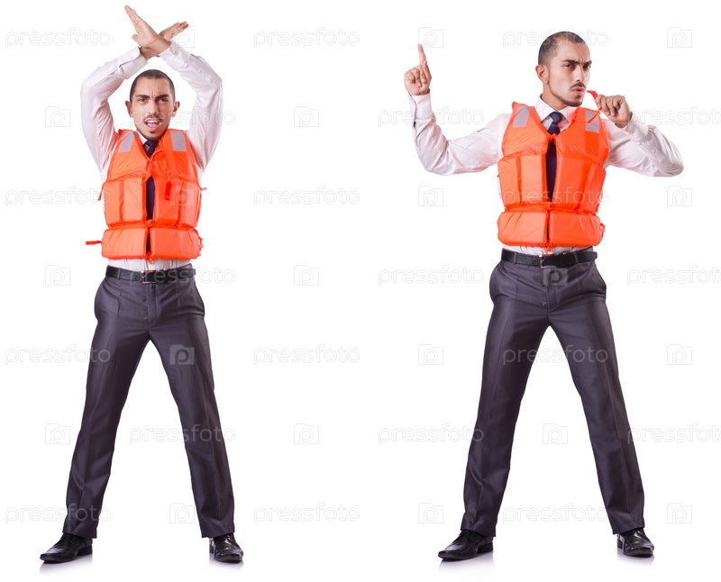 Бизнесмен с спасательным жилетом на белом