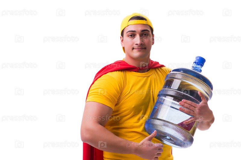 Мужчина доставляет бутылку с водой, изолированную на белом