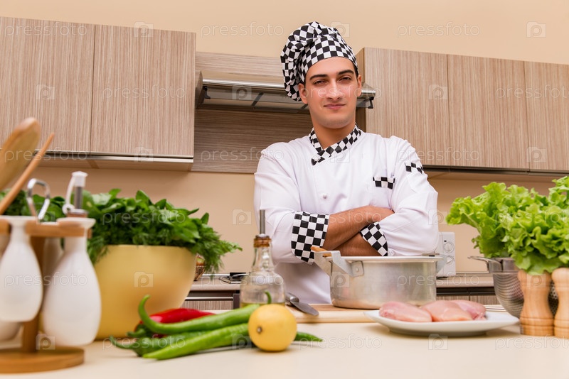 Молодой шеф-повар работает на кухне