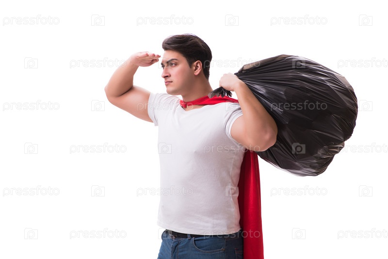 Супергерой с мешком для мусора, изолированным на белом