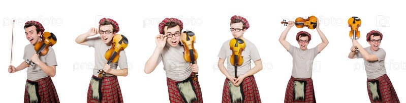 Забавный шотландец с скрипкой на белом