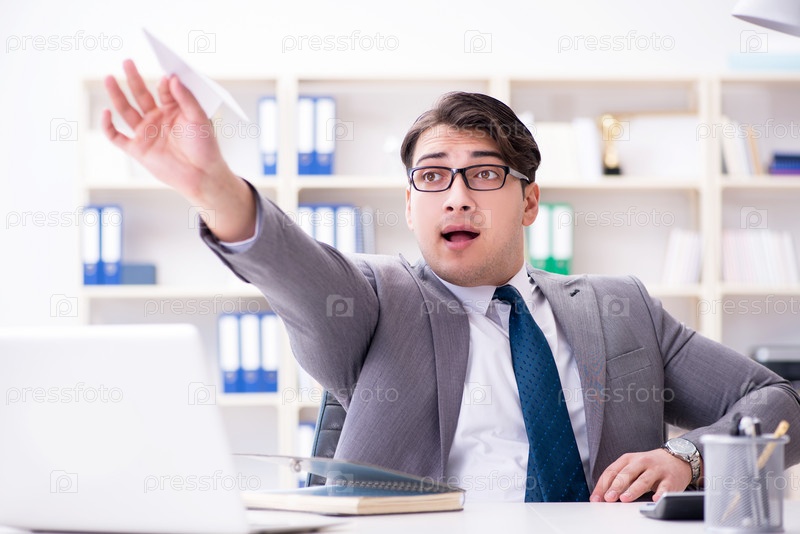 Бизнесмен с бумажным самолетом в офисе