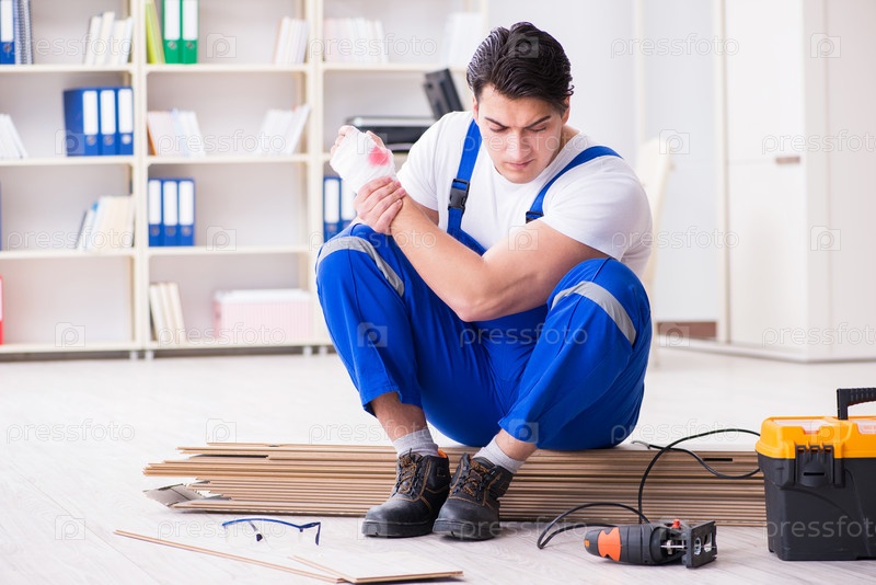 Молодой рабочий работает на напольной ламинированной плитке