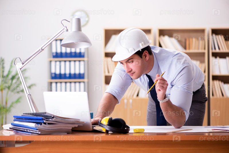 Инженер-начальник работает над чертежами в офисе