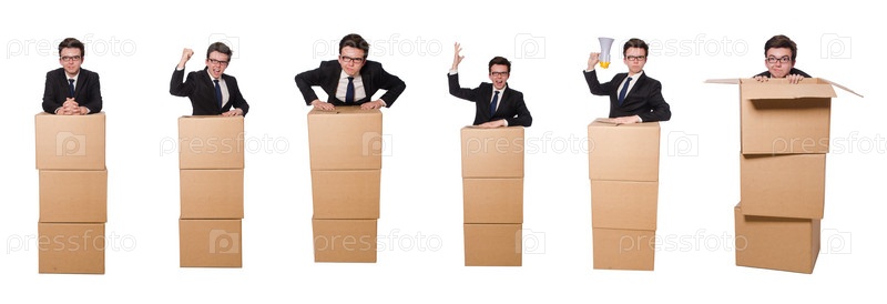 Забавный человек с коробками, изолированными на белом