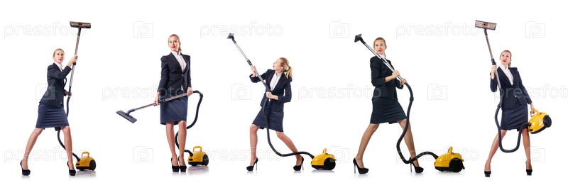 Деловая женщина убирает пылесосом на белом