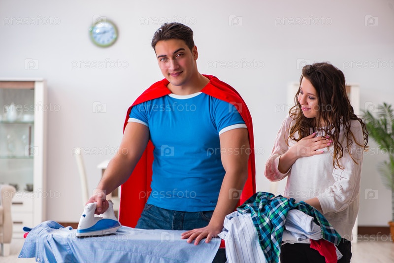 Супергерой-мужчина муж гладит дома, помогая жене