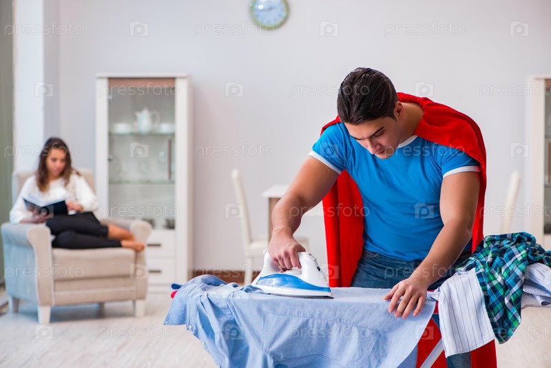 Супергерой-мужчина муж гладит дома, помогая жене
