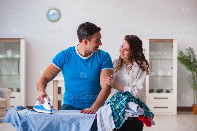 Мужчина муж гладит дома, помогая жене
