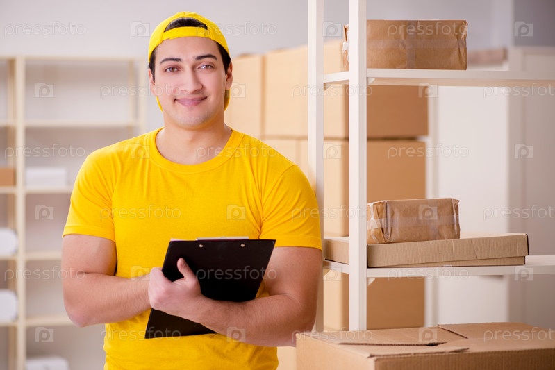 Мужчина, работающий в офисе службы доставки почтовых посылок