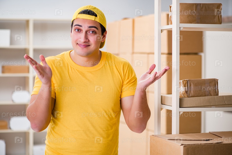 Мужчина, работающий в офисе службы доставки почтовых посылок