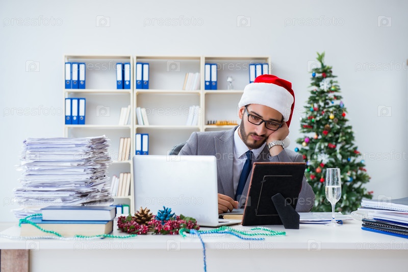 Молодой бизнесмен празднует Рождество в офисе