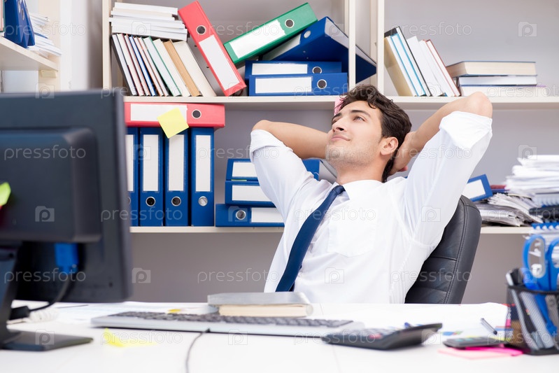 Бизнесмен, работающий в офисе с кучами книг и бумаг