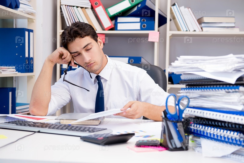 Бизнесмен, работающий в офисе с кучами книг и бумаг