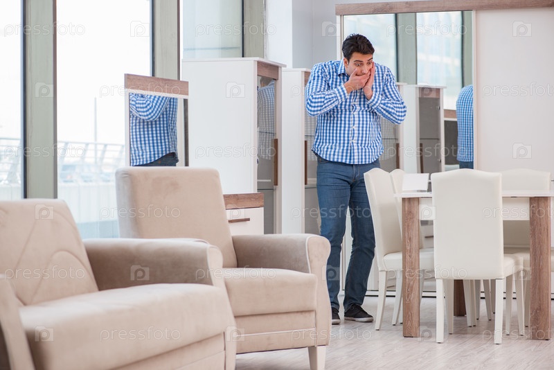 Молодой человек делает покупки в мебельном магазине