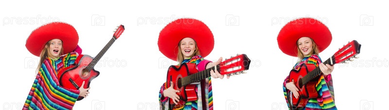 Красивая девушка в мексиканском пончо с гитарой изолирована на белом