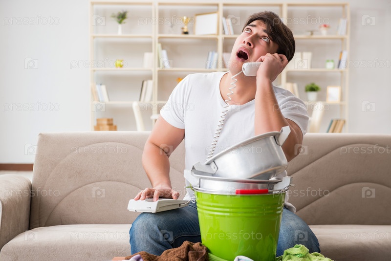 Мужчина дома, имеющий дело с соседней утечкой воды